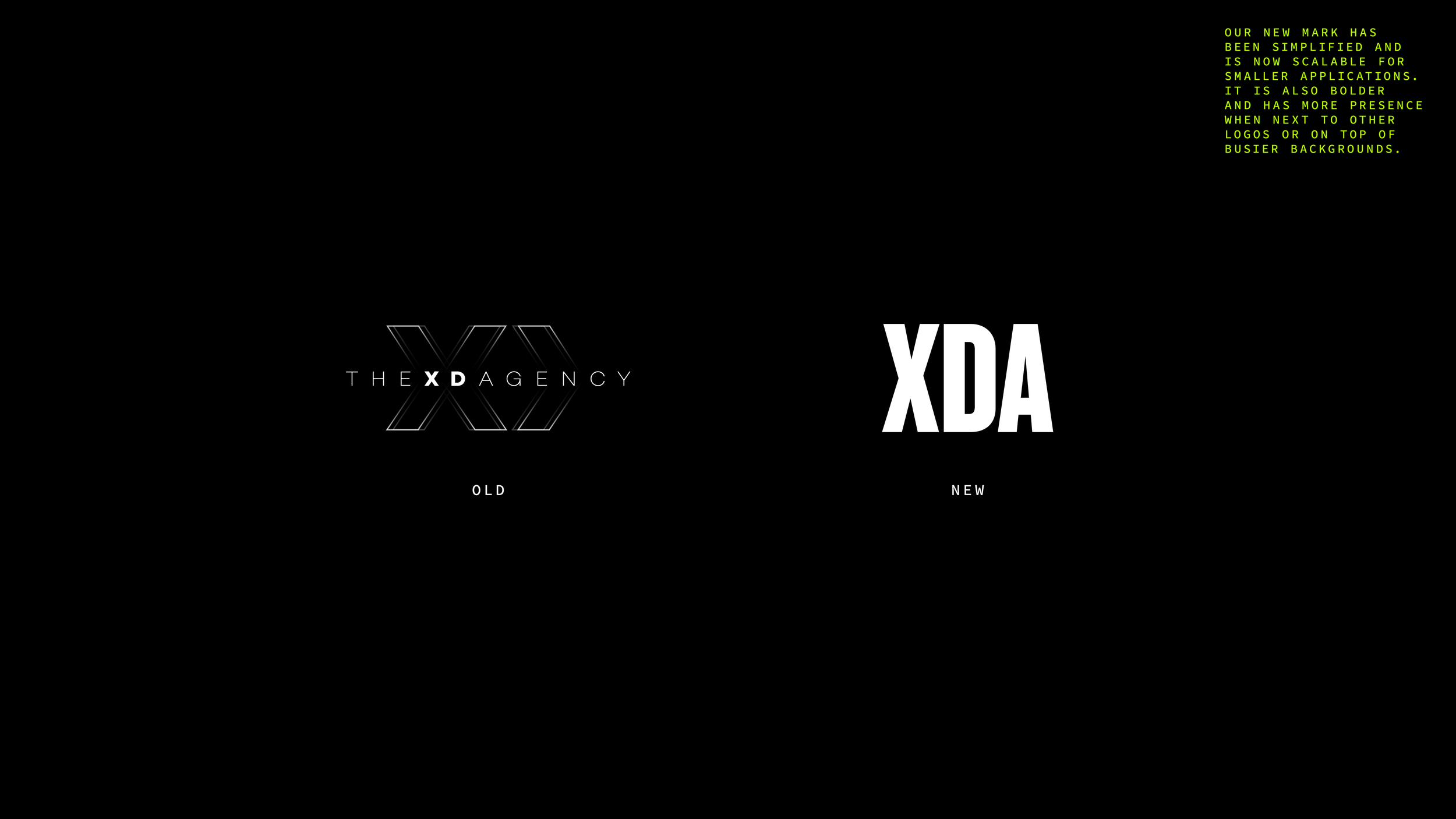 What started as a simple logo tweak, quickly unraveled into a complete redo of XDAGENCY'S visual identity. What was truly an "all hands on deck" passion project for XDA's creative team, I was lucky enough to provide art direction for the new rebrand. This was a complete overhaul that included logo design, typography, color theory, website, etc.